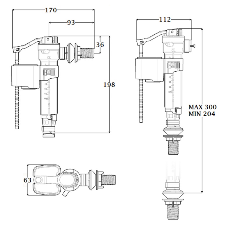 STY-707-M-D Uniwersalny zawór napływowy do spłuczki 3/8”, plastikowy, podłączenie dolne lub boczne